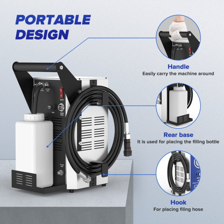 - Built-In Pressure Monitor: The brake flush system has a smart pressure monitor. Use the knob to set pressure between 0.6-3.0 BAR. If pressure drops or air enters, the pump stops automatically. The recycling bottle fits inside the machine for easy carrying.