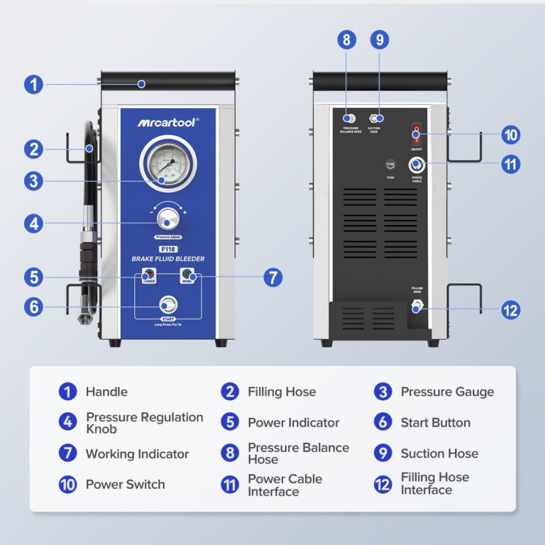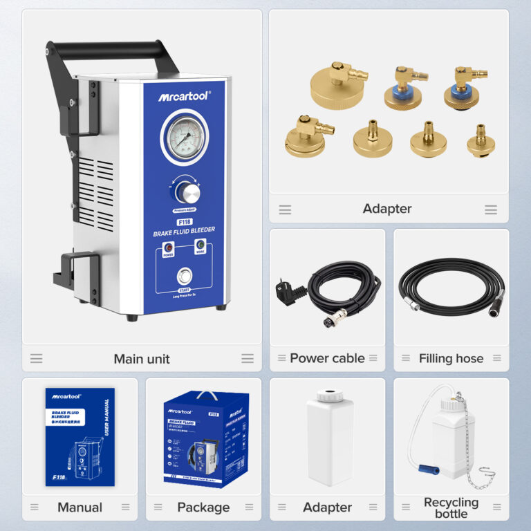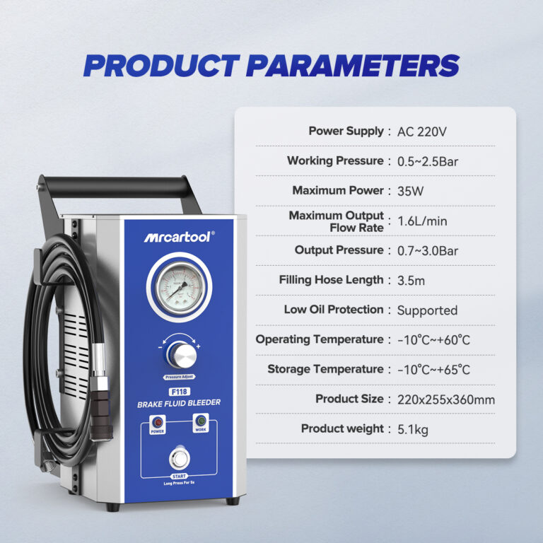 The Mrcartool F118 brake flush system works great for European, American, and Asian cars. It uses one small pump to change brake fluid fast, saving time and effort. The system lets you adjust the oil change speed to clean brake lines better and remove old oil completely. It also collects used brake fluid quickly while you work. The air intake has a special filter that removes water from air. This keeps moisture out of the brake fluid for cleaner, safer results. Strong power and smart design make brake maintenance easier for all car types.