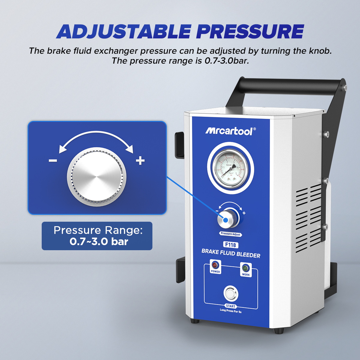 - Built-In Pressure Monitor: The brake flush system has a smart pressure monitor. Use the knob to set pressure between 0.6-3.0 BAR. If pressure drops or air enters, the pump stops automatically. The recycling bottle fits inside the machine for easy carrying.