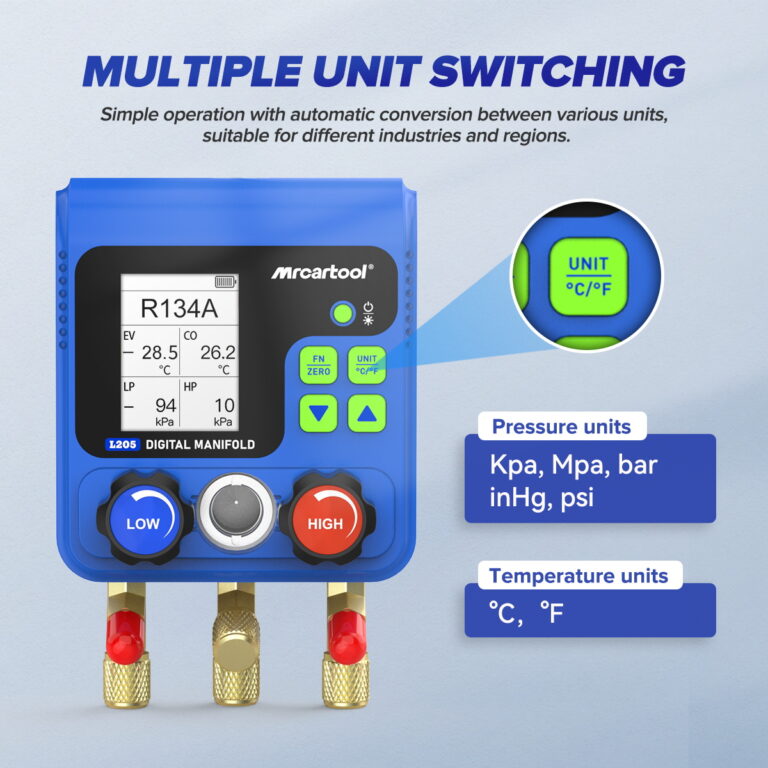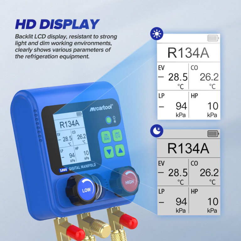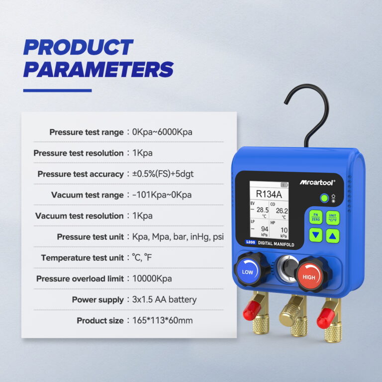 MRCARTOOL L205 HVAC Manifold Gauge Set provides simultaneous dual pressure/temperature measurements, a built-in database of 89 refrigerant pressures, and the ability to calculate subcooling and superheating. In addition, it can test vacuum measurement percentages; pressure leakage measurements, and leakage time velocity logging. With this versatile, accurate and easy-to-operate digital manifold, you’ll be able to get the job done you deserve.