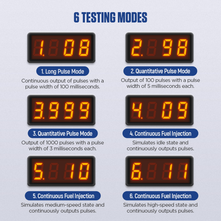 - Test Mode 1: Generates a 100-millisecond wide pulse every second, continuously outputting pulses to the fuel injector. During testing, the sound of the injector’s action should be audible. Use a multimeter to measure voltage fluctuations at the injector electrode. The digital display shows the continuous testing time in minutes.