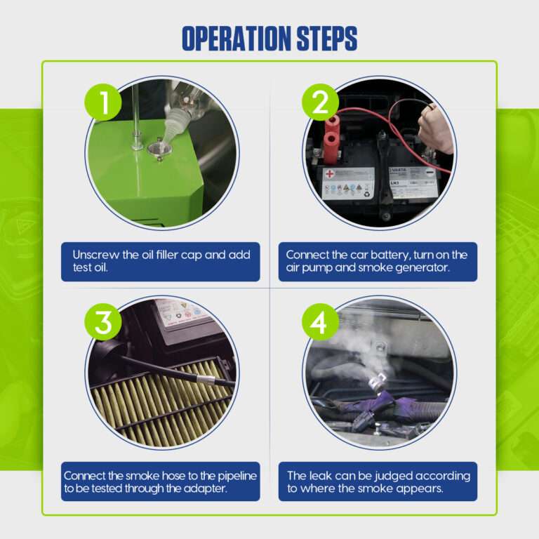 - Step 1: Pour 10-15 ml of baby oil into the smoke test machine for its first use. Open the engine cover and hang the Smoke Leak Detector inside it.