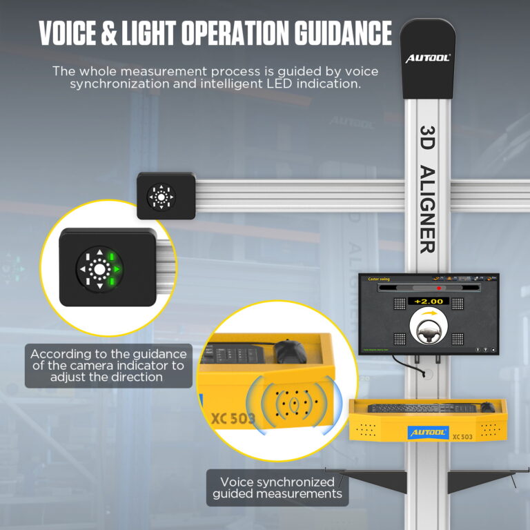 • Dual Indication of Sound and Light: The AUTOOL XC503 3D Wheel Alignment Machine guides measurements through voice synchronization throughout the operation process, with an LED intelligent display. Operators can accurately complete alignment operations without needing to constantly look at the computer screen. The user can adjust the cart back and forth or left and right according to the camera indicator light, optimizing working efficiency.